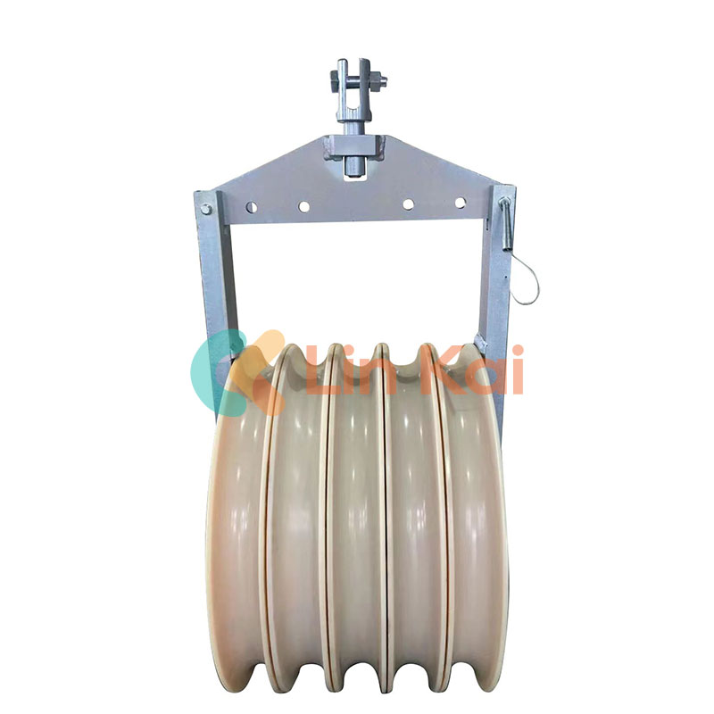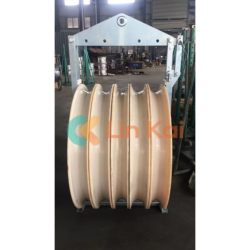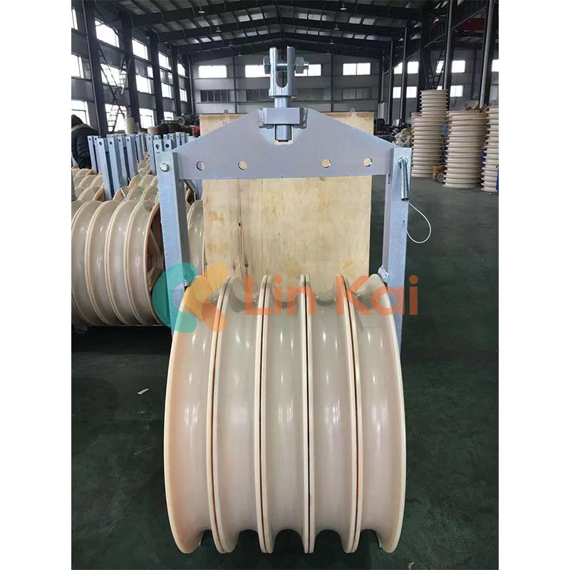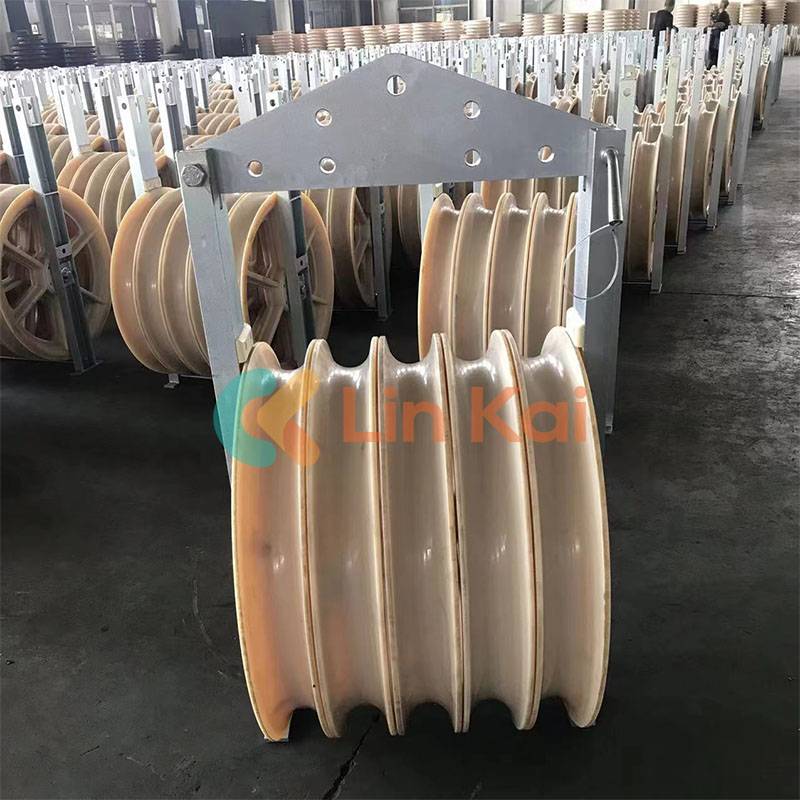 Para o ACSR 630 são utilizados blocos de encordoamento de condutores com grandes rodas de náilon de 822 mm. Esses blocos também podem ser usados ​​para suportar linhas de comunicação, OPGW, ADSS e condutores. Numerosos modelos de blocos de encordoamento de condutores são produzidos pela China Ningbo Linkai para diversas aplicações na instalação de linhas de transmissão aéreas. Blocos de amarração de condutores fabricados na China: são usados ​​para colocar linhas de transmissão com quatro condutores divididos no alto.